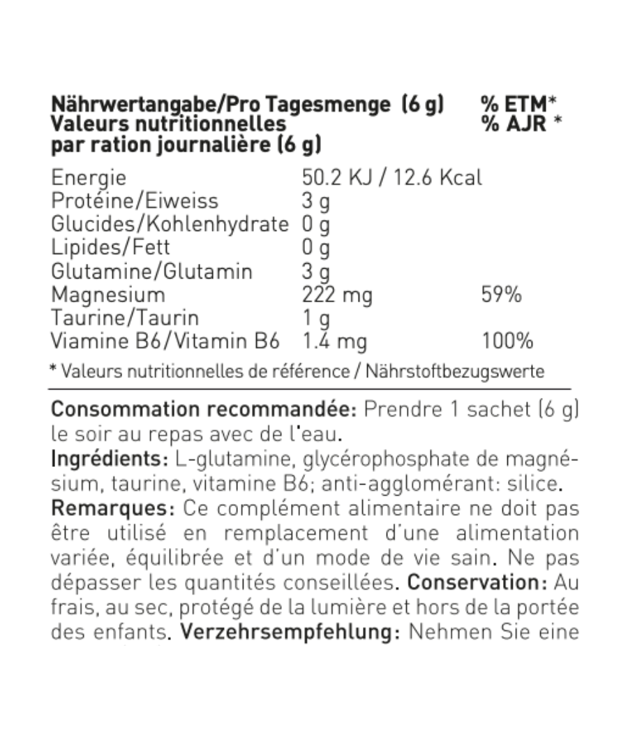Night (new name for the 3-2-1 formula) contributes to better recovery thanks to the synergy of 4 elements: glutamine, taurine, magnesium and vitamin B6.